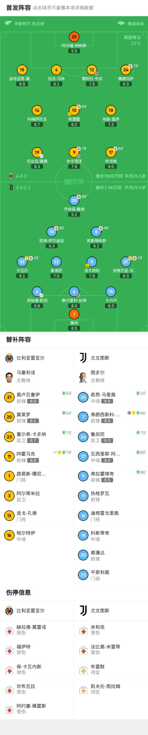 尤文客场2-2遭比利亚雷亚尔绝平,雷纳托-韦加救主