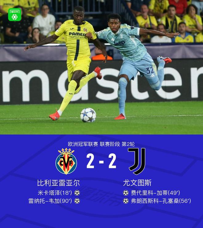 北京时间10月2日,欧洲冠军联赛联赛阶段第2轮展开较量,比利亚雷亚尔迎战尤文图斯。比赛中,米卡塔泽接尼古拉-佩佩的助攻率先破门,为比利亚雷亚尔取得领先。随后,费代里科-加蒂在劳埃德-凯利的助攻下扳平比分。不久后,弗朗西斯科-孔塞桑建功,帮助尤文图斯实现反超。比赛进入尾声阶段,阿霍马克送出助攻,雷纳托-韦加破门,将比分定格为2-2。最终双方握手言和,各取一分。