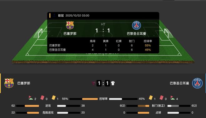 巴萨vs巴黎半场数据:双方均6次射门2次射正,控球率巴萨领先